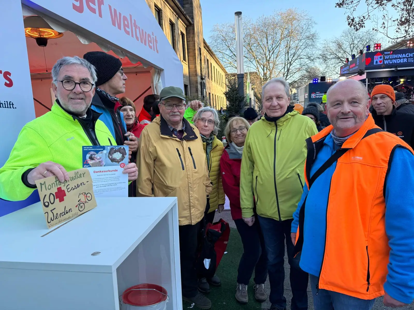 Die Fotos zeigen die Montagsradler beim Besuch des Ateliers von Johannes Brus im ehemaligen Krupp’schen Wasserwerk und beim WDR-Weihnachtswunder 2025 auf dem Essener Burgplatz.